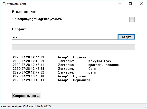Сразу вопрос, на каком? Разумеется на сайте каталога. Предположим, мы организовали внешний доступ к каталогу. Но как посмотреть, что на нём происходит? Ведь посещения сайта официально идут в зачёт библиотеке, наряду с посещением самой библиотеки. Что ищут на нём посетители и находят ли? Это достаточно ценная информация. На её основе можно формировать заявки на закупку, отслеживать тренды в интересах пользователей. Это гораздо точнее формального анкетного опроса. При этом всё уже есть. Не надо прилагать дополнительных усилий. Надо только достать эту информацию. К сожалению, в «АС-Библиотека-3» этот вопрос пока не решён. Есть файл «EWWW.log», но он, по какой-то причине заблокирован для записи рабочему процессу «IIS» «w3wp.exe». Однако даже после разрешения записи «для всех», в нём не появляется ничего интересного. Только старт и стоп сервиса. Где же искать. На помощь приходит лог «IIS». Если помнишь, в статье «Настройки IIS» я рекомендовал настроить элемент "Ведение журнала HTTP". Он то и соберёт необходимую информацию. Нам останется только прочитать её. Конечно, «вручную» лог не разобрать. Поэтому я набросал простой парсер, который ты можешь СКАЧАТЬ ПО ЭТОЙ ССЫЛКЕ (он также доступен на панели справа). Это очень простое приложение, не требующее установки. А удаляется обычным удалением. Просто распакуй архив и запусти WebGateParser.exe.